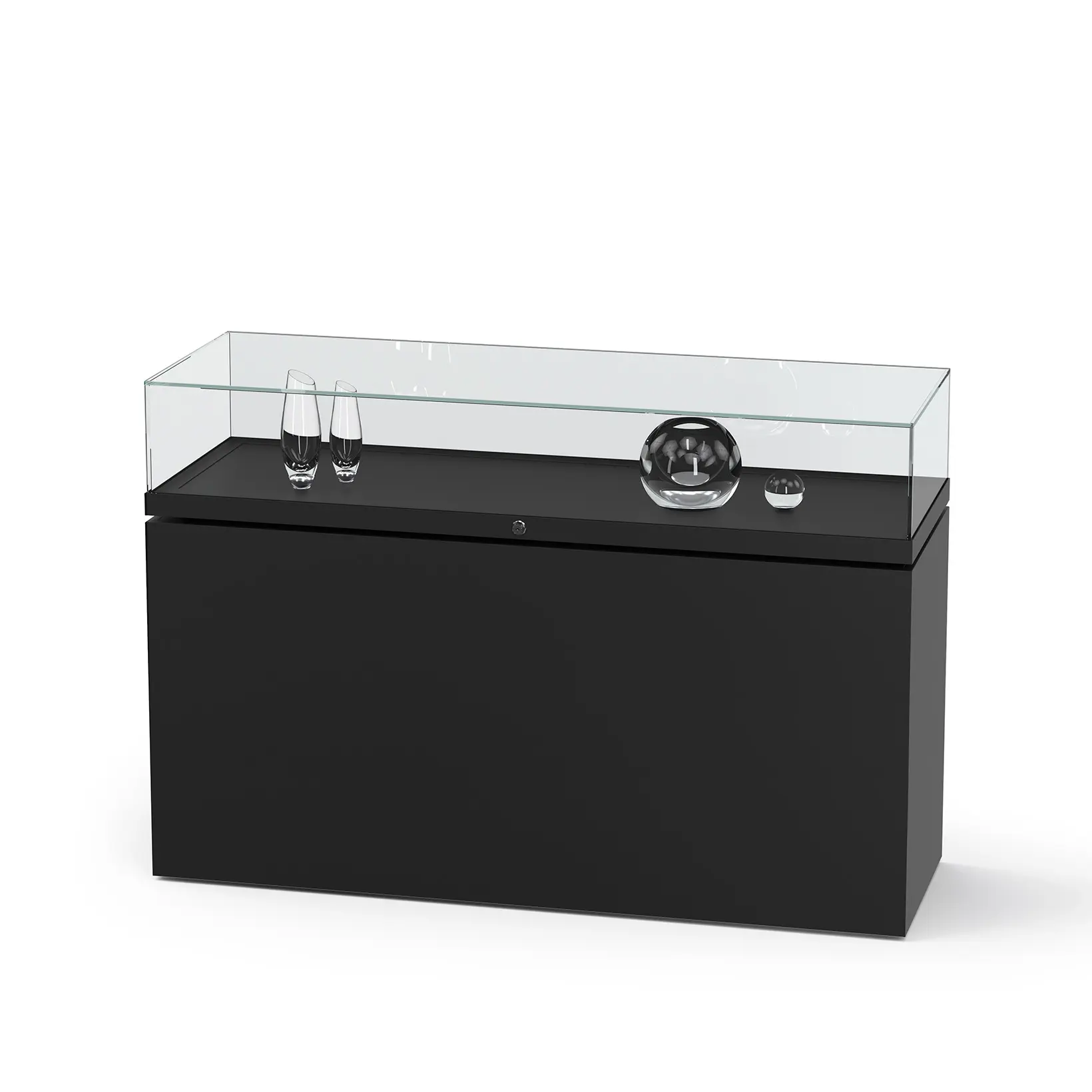 Tischvitrine Glas mit geschlossenem Sockel Rahmenlose Ganzglas-Konstruktion mit 8mm ESG-SicherheitsglasDesign-Vitrine für Museen, Ausstellungen oder das exklusive BüroSockel aus beschichteter HolzplatteGrößen B/H/T1000 × 970 × 500 mm1200 × 970 × 500 mm1400 × 970 × 500 mmHöhe des Glaskorpus 220 mmÖffnung - Glaskorpus aufklappbar mit seitlichen Gasdrucköffnern, die den Aufbau arretierenVerglasung - Einscheiben-Sicherheitsglas / ESGOberfläche – schwarz - optional: weiß oder hellgrauBeleuchtung - ohne Beleuchtung - optional: waagerechte Stahlerschiene mit LED-Strahlern, inkl. TrafoSchließung - Sicherheitsschlößer mit je 2 Schlüsseln